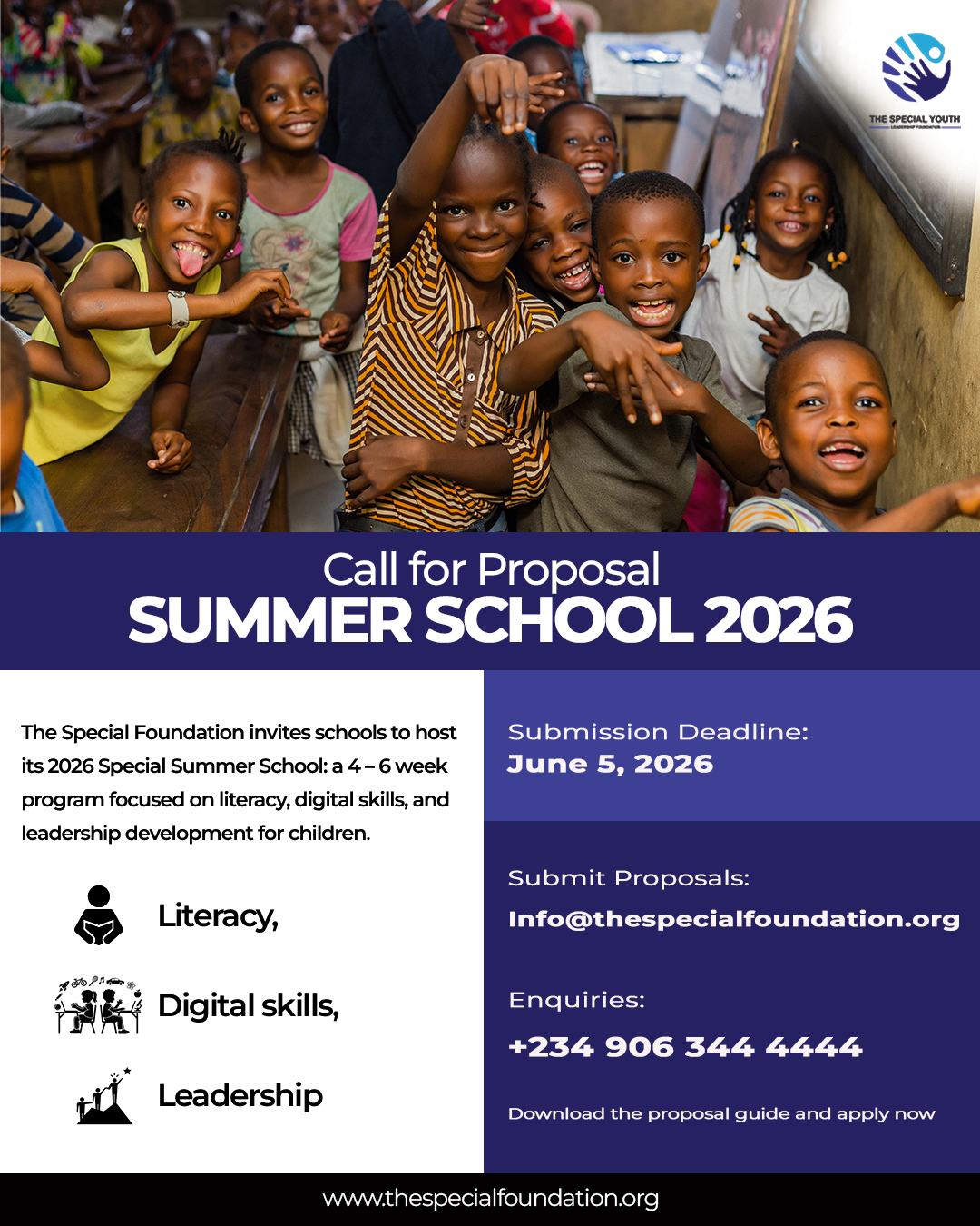 The Special Foundation invites schools and learning centers to apply to host the 2026 Special Summer School — a 4–6 week program designed to equip children with foundational, digital, and leadership skills. We’re looking for partners ready to deliver structured, high-impact learning for both in-school and out-of-school children within their communities.